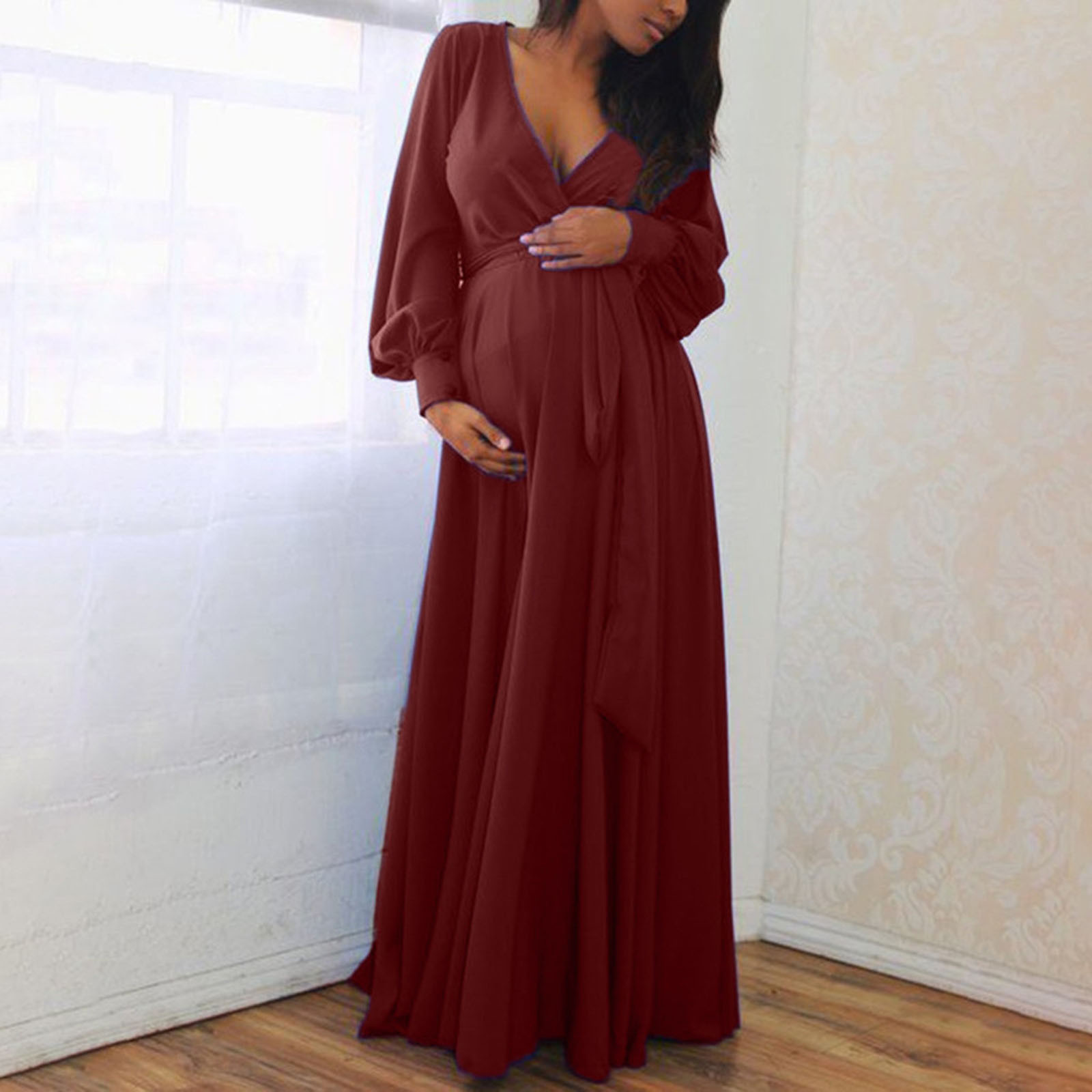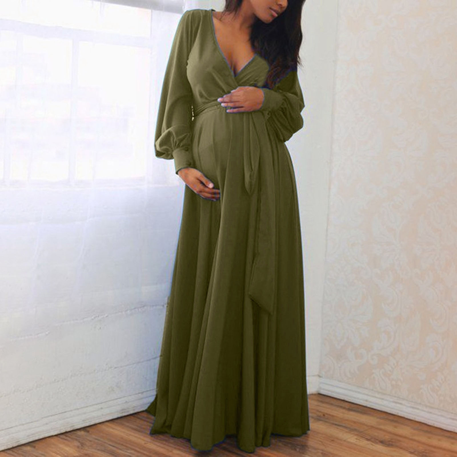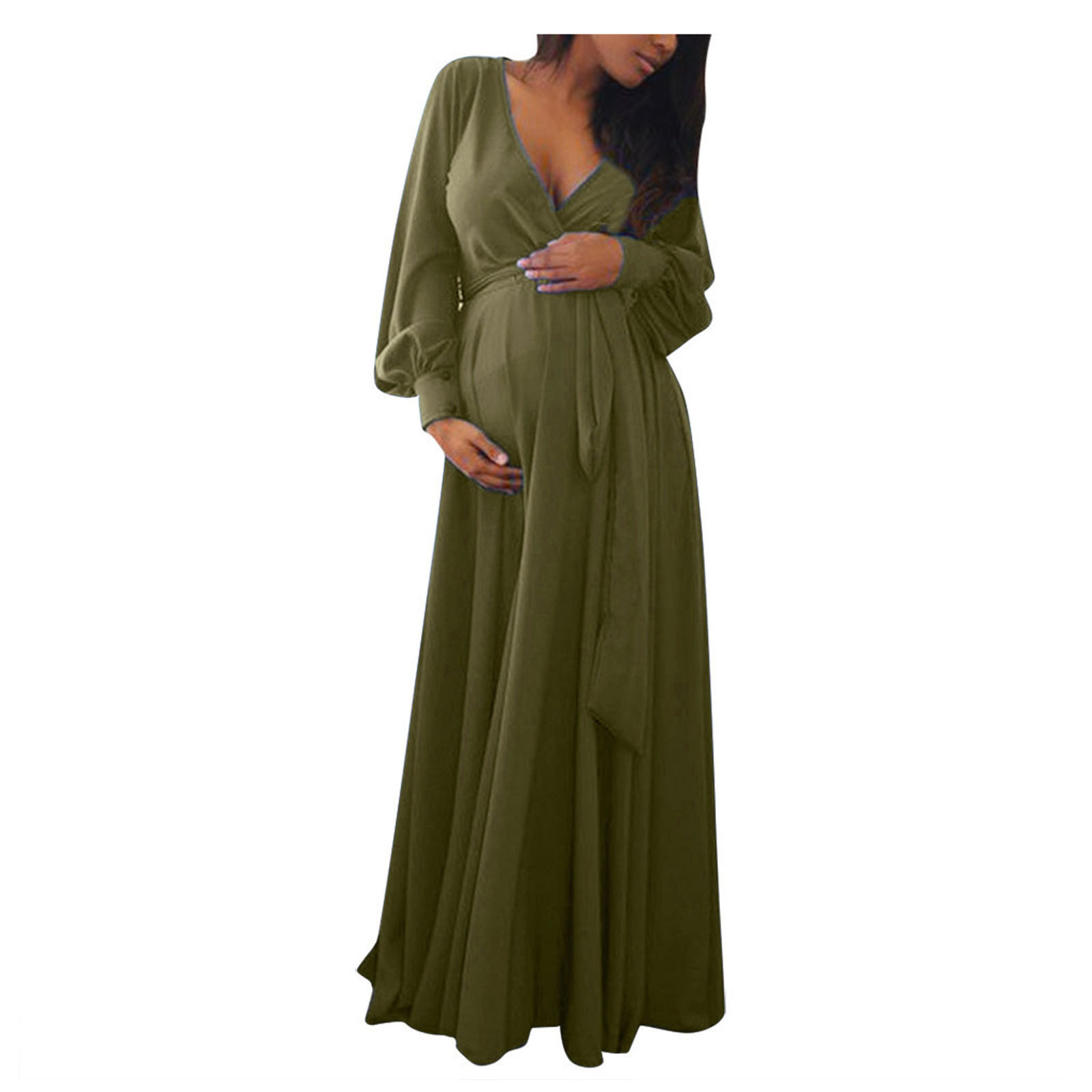 Summer V-neck Long Sleeve Solid Color Bandage Maternity Elegant Dress Long Skirt