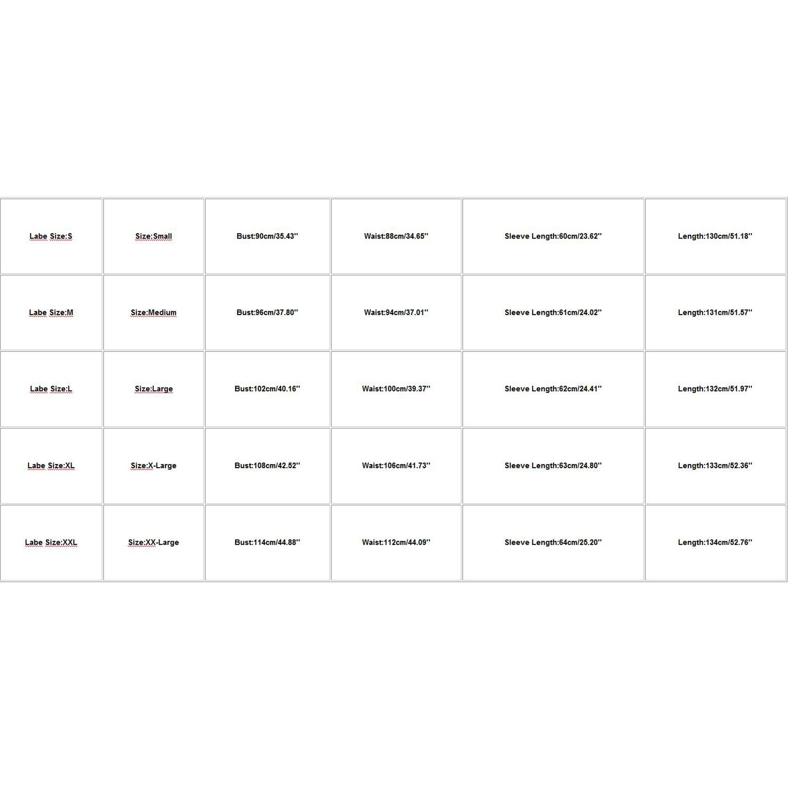 Labe Size | Size | Bust | Waist | Sleeve Length | Length |